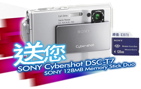 即送原裝行貨 Sony Cyber-shot T7 500萬數碼相機乙部 連128MB Memory Stick Duo。